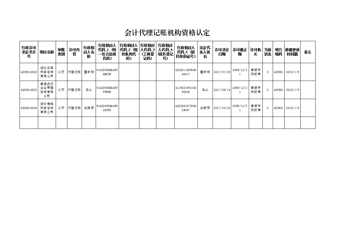 会计代理记账机构资格认定企业名单(2018年第一期)