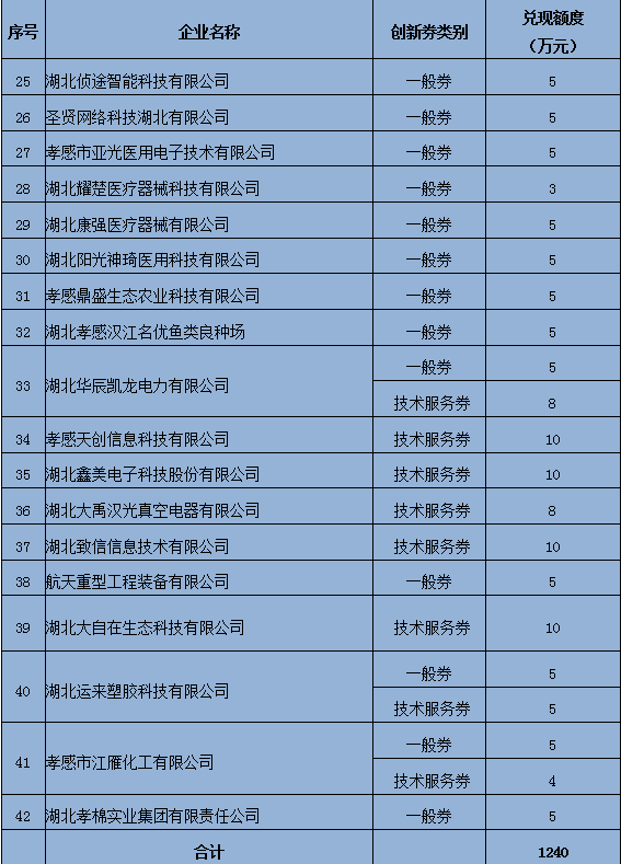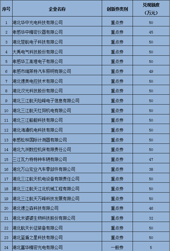 根据《孝感市科技创新券实施管理办法(试行)》(孝感政发〔2015〕9号)文件规定,经领券单位申报,第三方专家现场评审,市科技创新券领导小组会议审定,并报经市人民政府同意,共评出拟兑现企业42家,总金额1240万元(总计项目45项,其中:重点券项目23项,一般券项目14项,技术服务券项目8项)。现将拟兑现企业向社会公示(排名不分先后)。公示期为5个工作日(2017年11月20日—2017年11月24日),公示期内如对以上拟兑现企业有异议,可向市科技创新券实施工作领导小组办公室提出书面意见,并写明真实姓名、工作单位、联系地址和电话,以便调查核实,否则不予受理。如异议情况经调查属实,创新券领导小组办公室将取消其兑现资格。