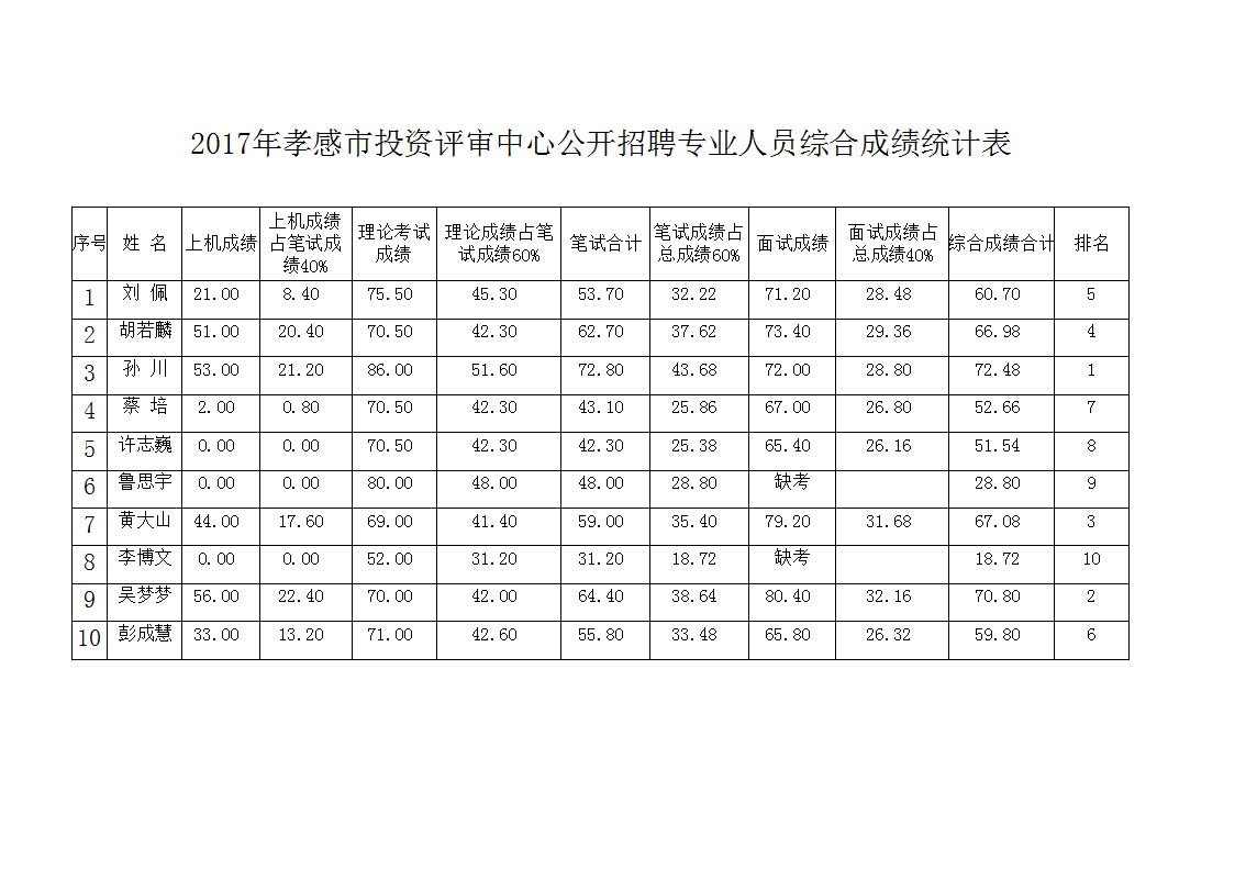 2017年孝感市投资评审中心公开招聘专业人员综合成绩公布